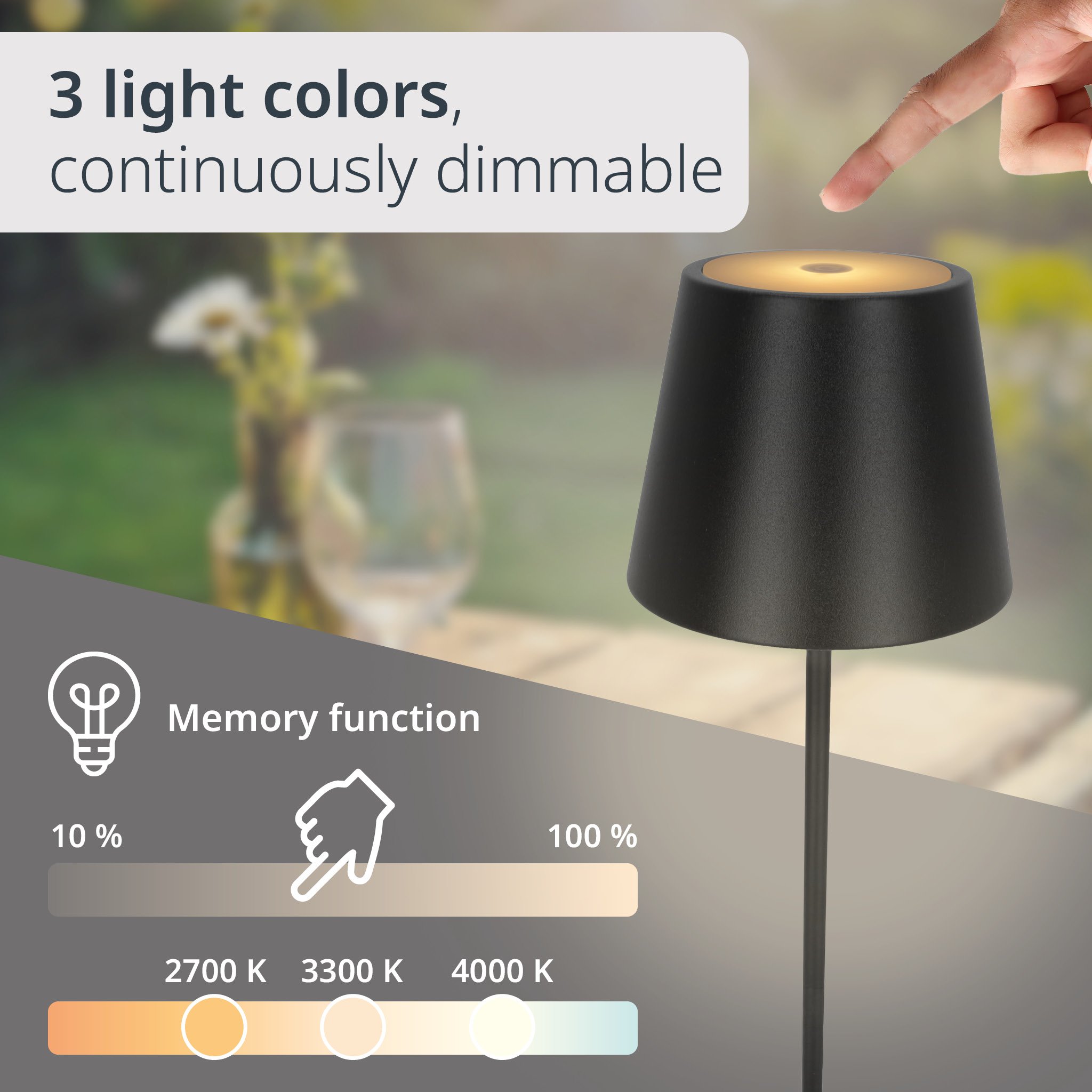 The battery lamp is splash-proof rated IP44 and has a non-slip base. Perfect for cozy garden parties or relaxing evenings on the balcony, this table lamp always provides the right light.