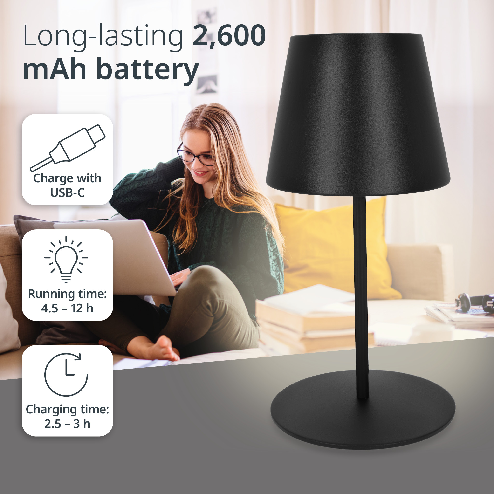 • Long-Lasting Battery: With a charging time of 2.5-3 hours, the 2,600 mAh battery provides up to 12 hours of light. The rechargeable lamp is USB-C chargeable and ideal for long use both indoors and outdoors.