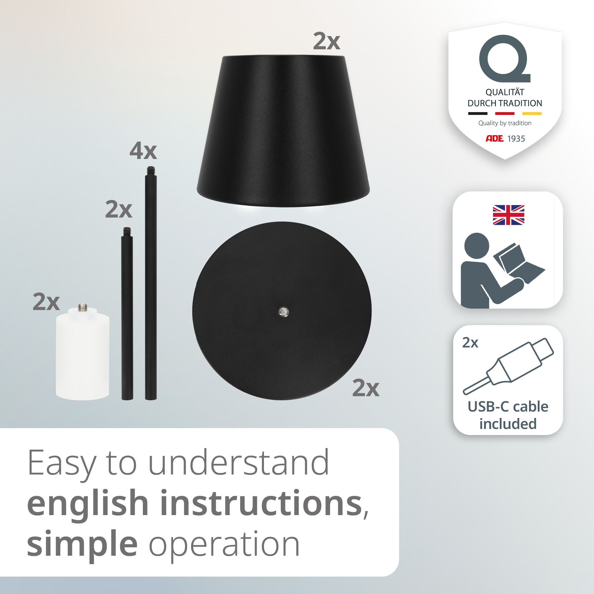 With the included rods (1 x 11 cm and 2 x 15 cm), you can adjust the height of the table lamp individually. All rods are combinable and allow for four different heights – perfect for any situation, whether as atmospheric lighting on the table or as subtle light on the floor.