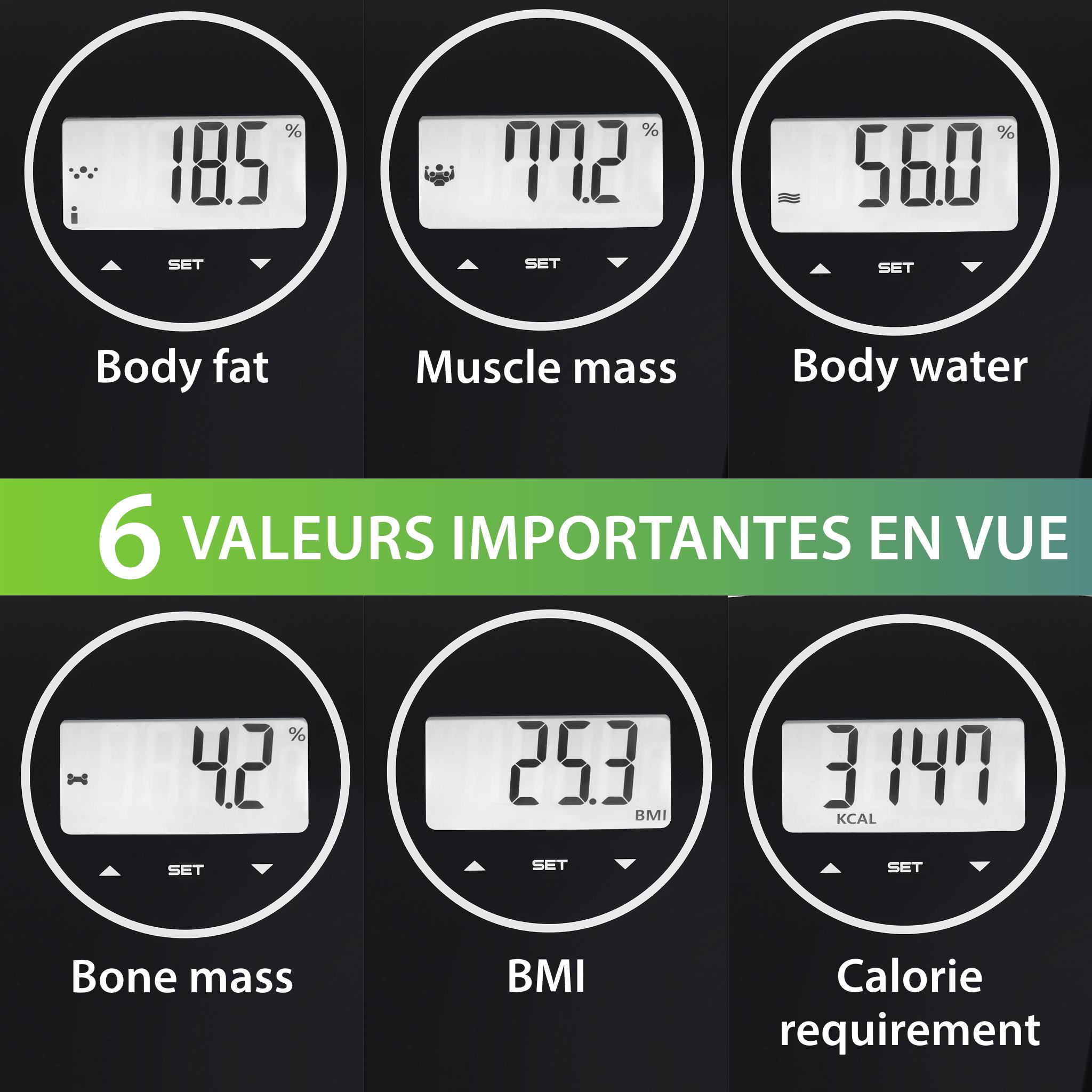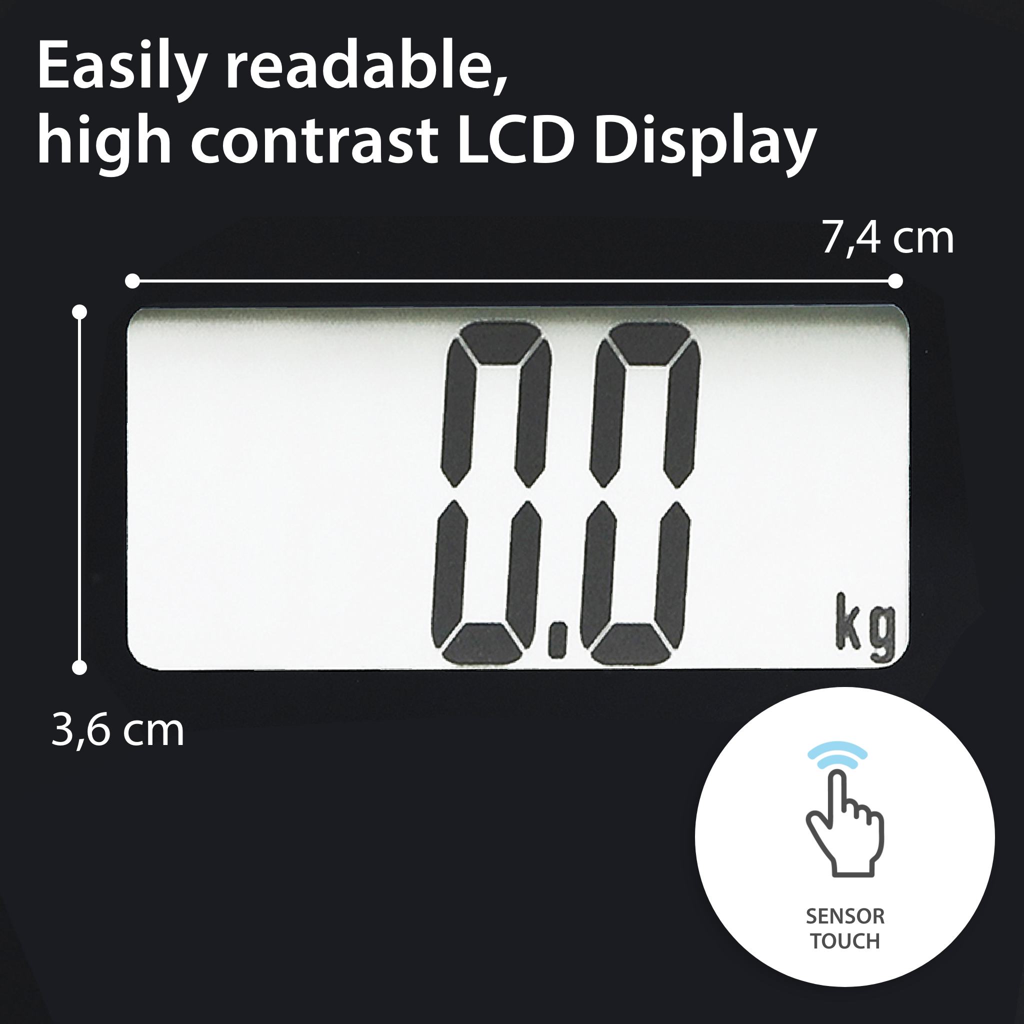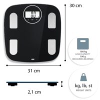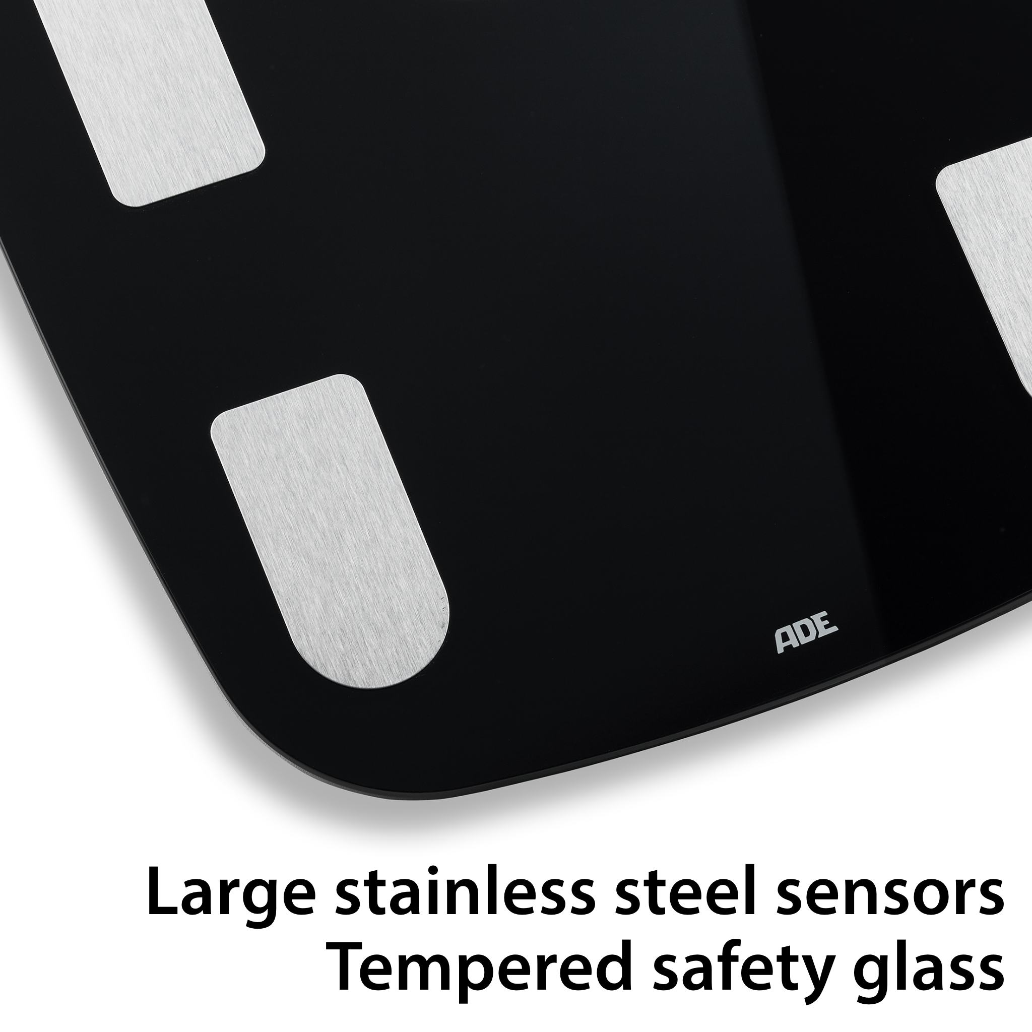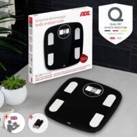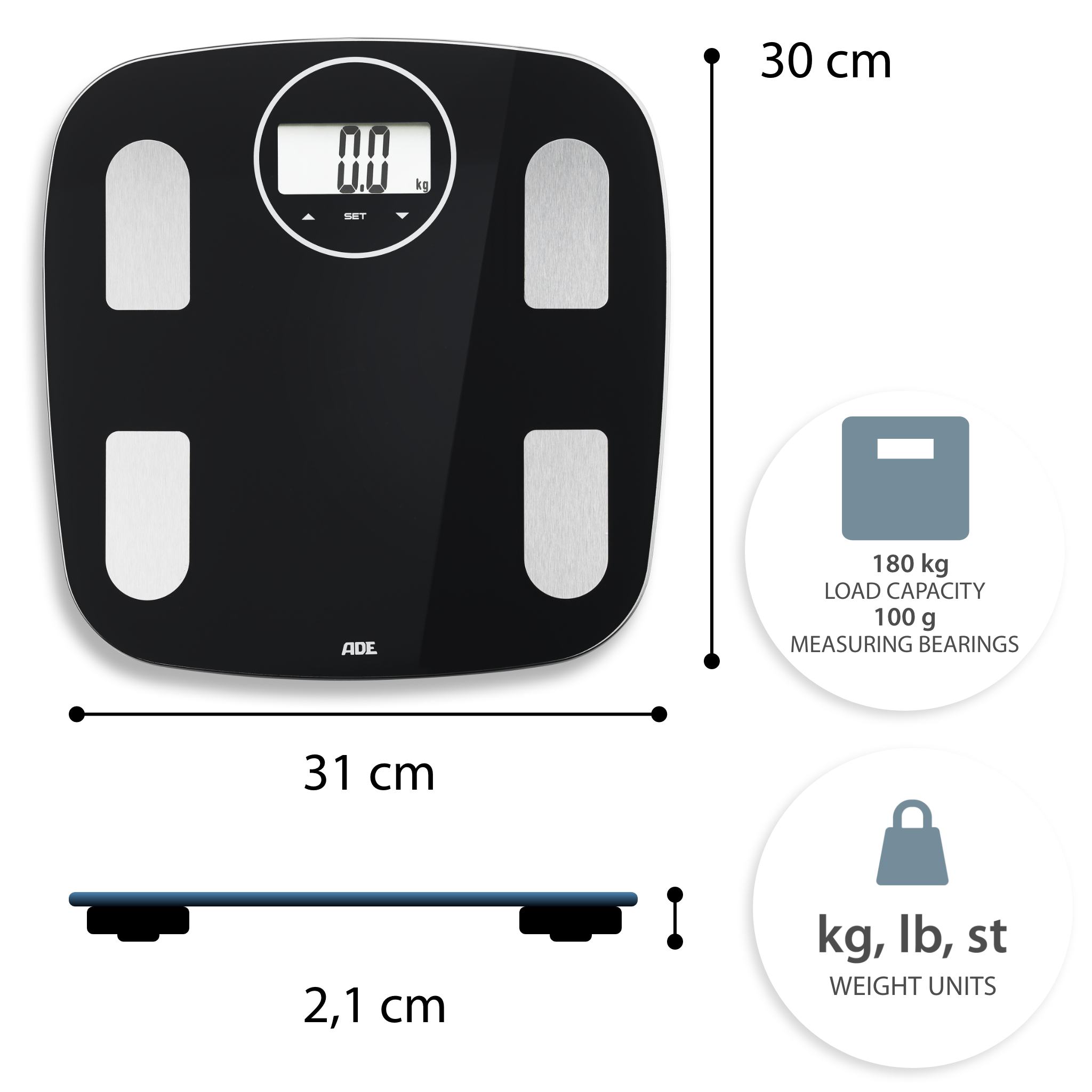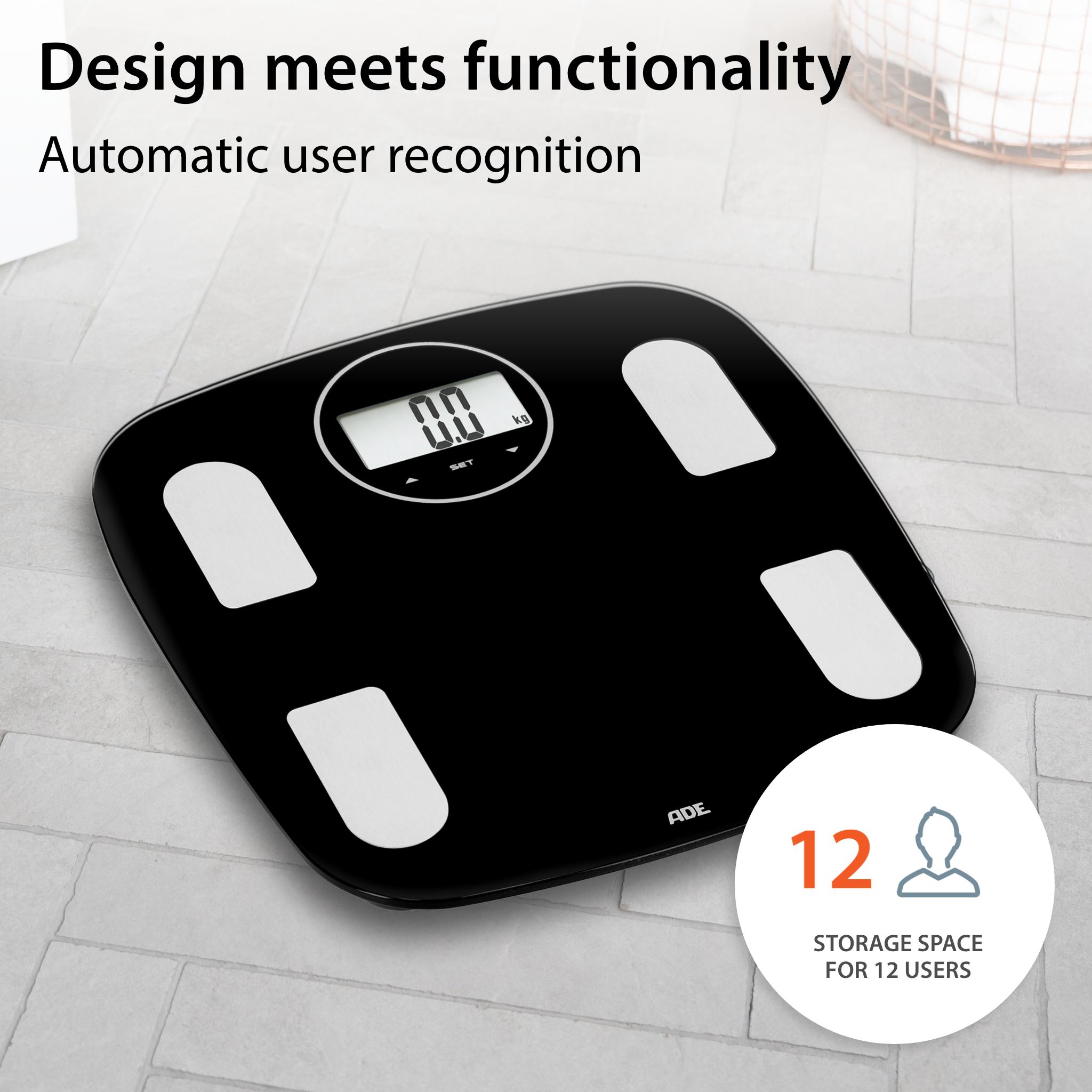 Everything in balance? The ADE diagnostic scale provides the answer with these values: it determines body fat, body water, muscle mass and bone mass in precise 0.1 % steps and calculates the BMI (body mass index) and the BMR (calorie requirement). Recognition service in the bathroom: The Nova body analysis scale is equipped with automatic user recognition by means of body weight. This means that the scale can store the weight of up to 12 users and recognise its user from this. Ideal for the bathroom of families and shared flats. The beautiful glass design in black or white with the stainless steel-look foot electrodes is worth looking at during the daily weighing ritual. Discreet sensor buttons ensure pleasant operating comfort.