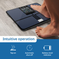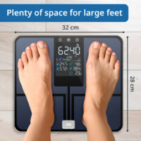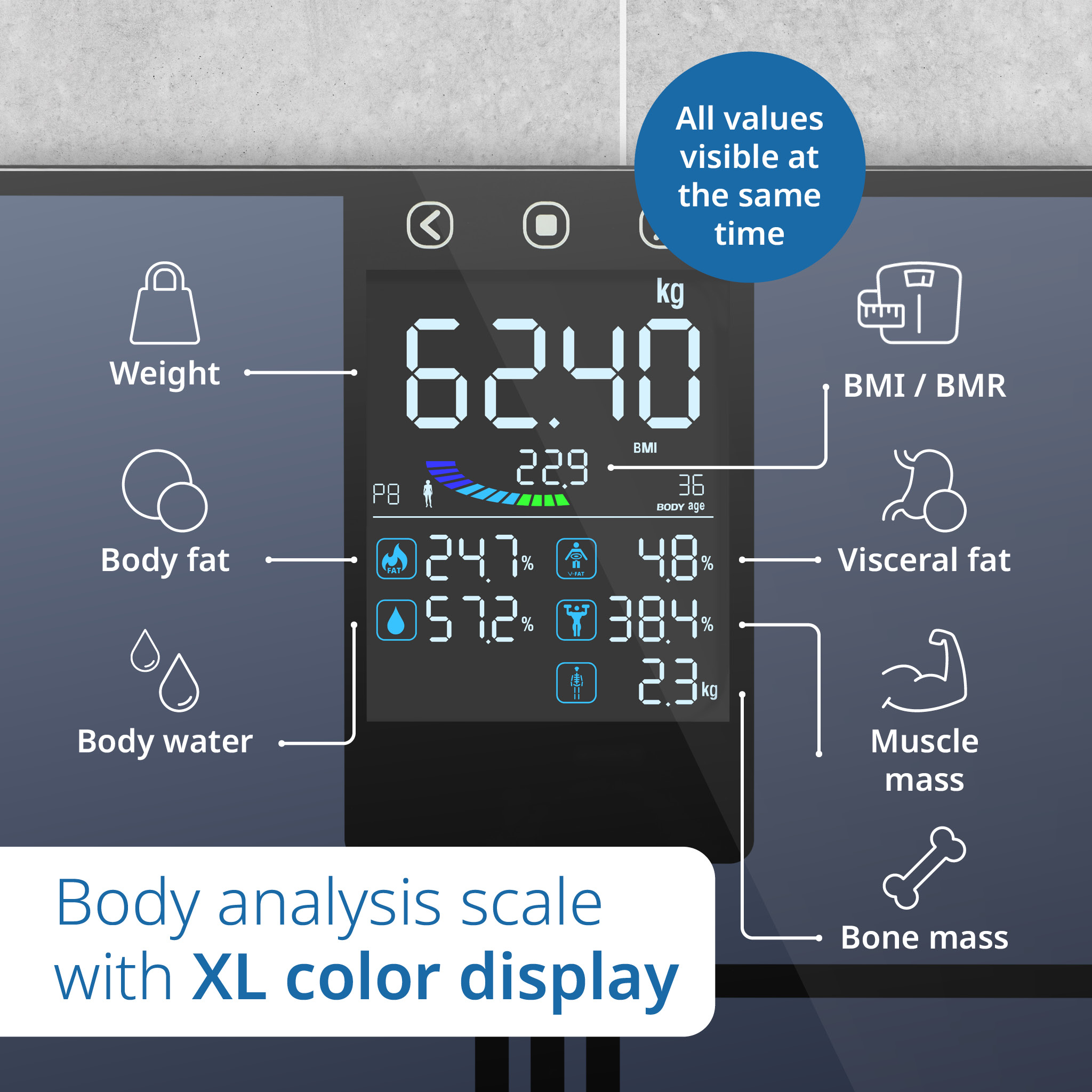 • All body measurements visible at a glance: the bathroom scales display weight, body fat, muscle mass, water percentage, bone mass, BMI, BMR and biological age simultaneously
