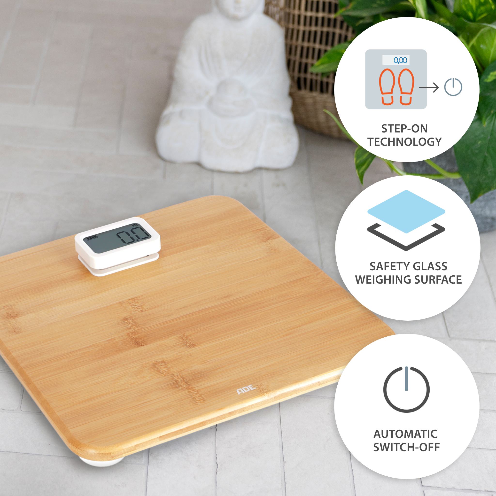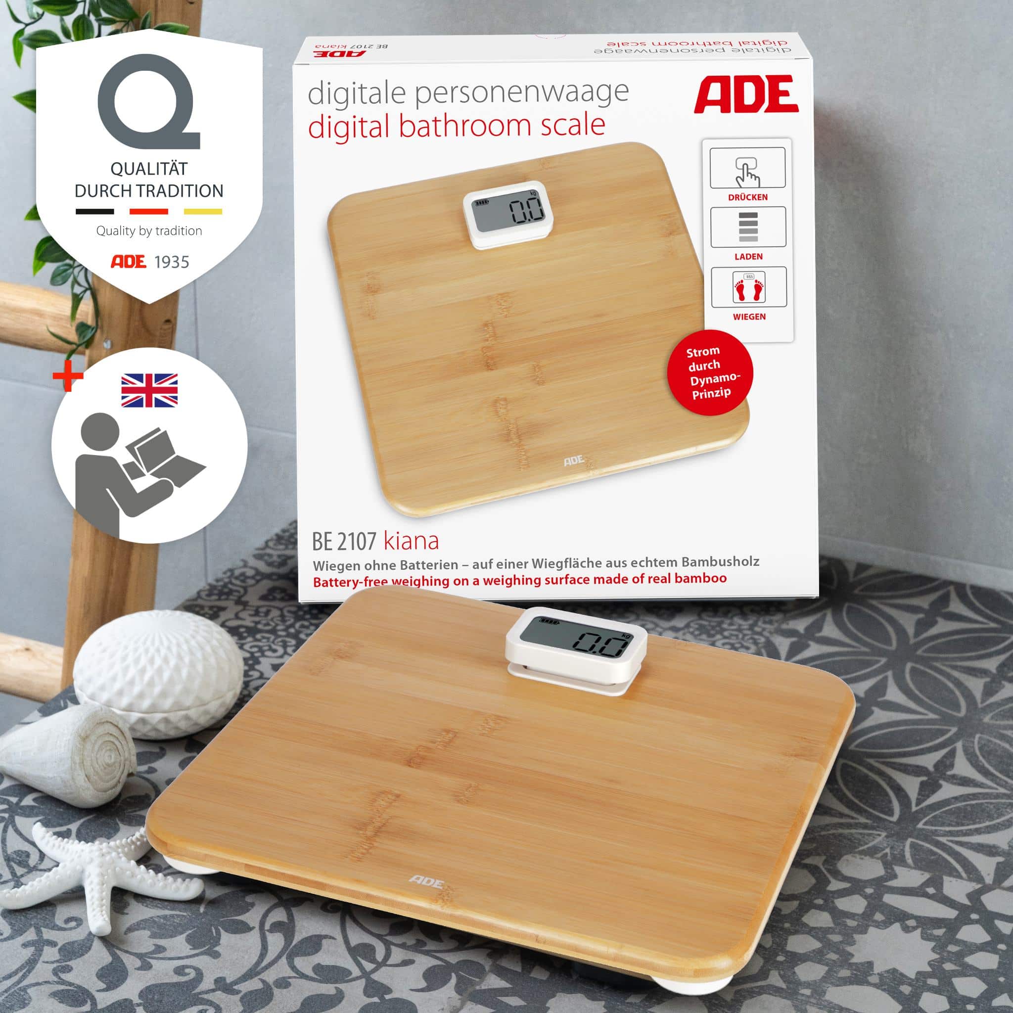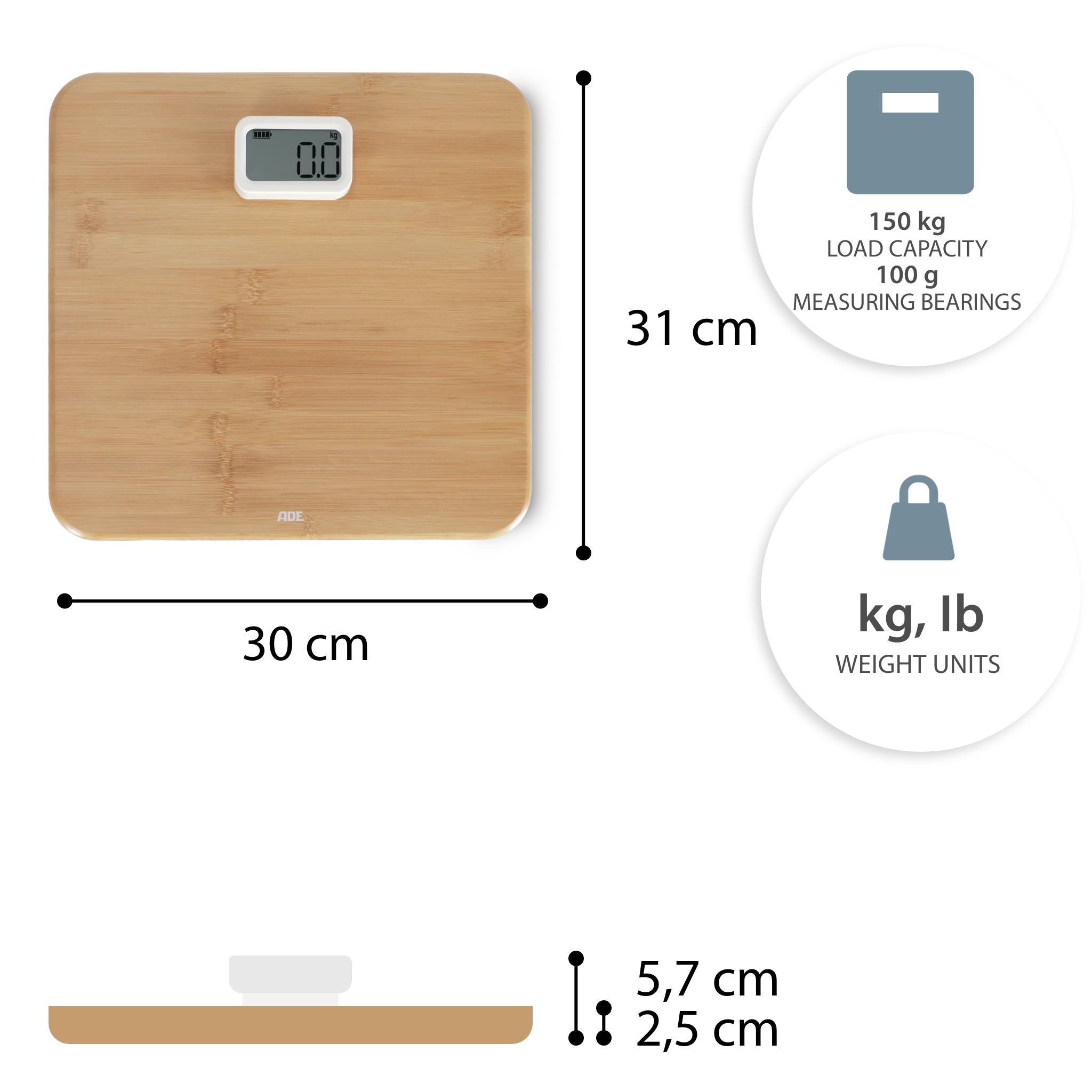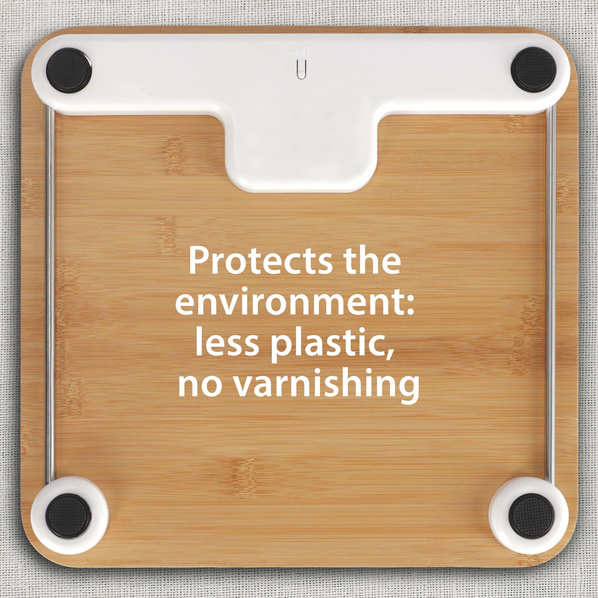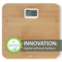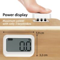 The Kiana bathroom scales are packed with environmentally friendly details. We have dispensed with batteries altogether. And yet the scale works digitally. Thanks to the power display with dynamo principle. Pressing the display three times activates the dynamo and the scale is ready for weighing. The body of the scale is made of the renewable raw material bamboo. The amount of plastic is reduced to a minimum – only the weighing cells and display are made of white, unpainted plastic. The 12 mm thick footprint measures a comfortable 310 x 300, the LCD display 59 x 32 millimetres.