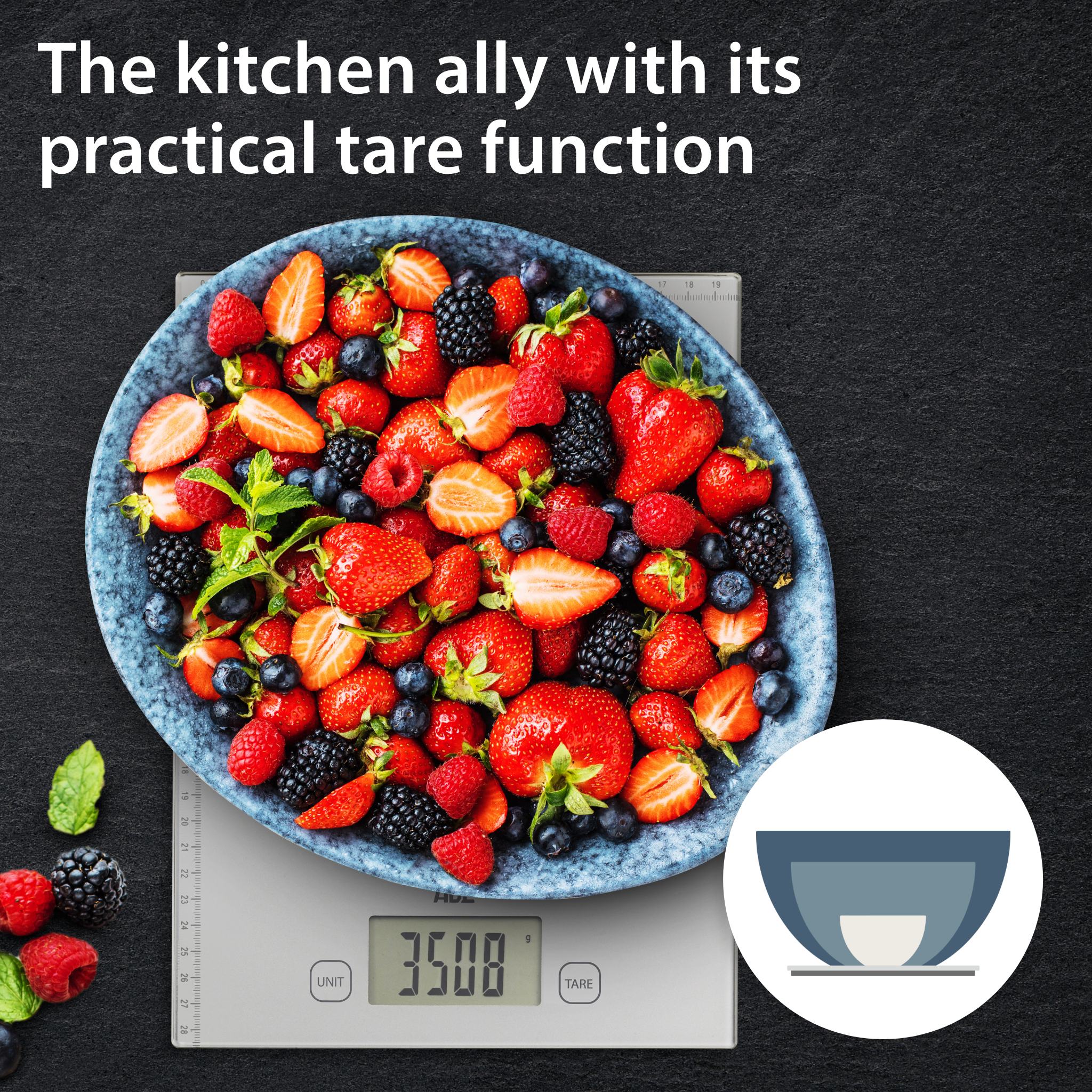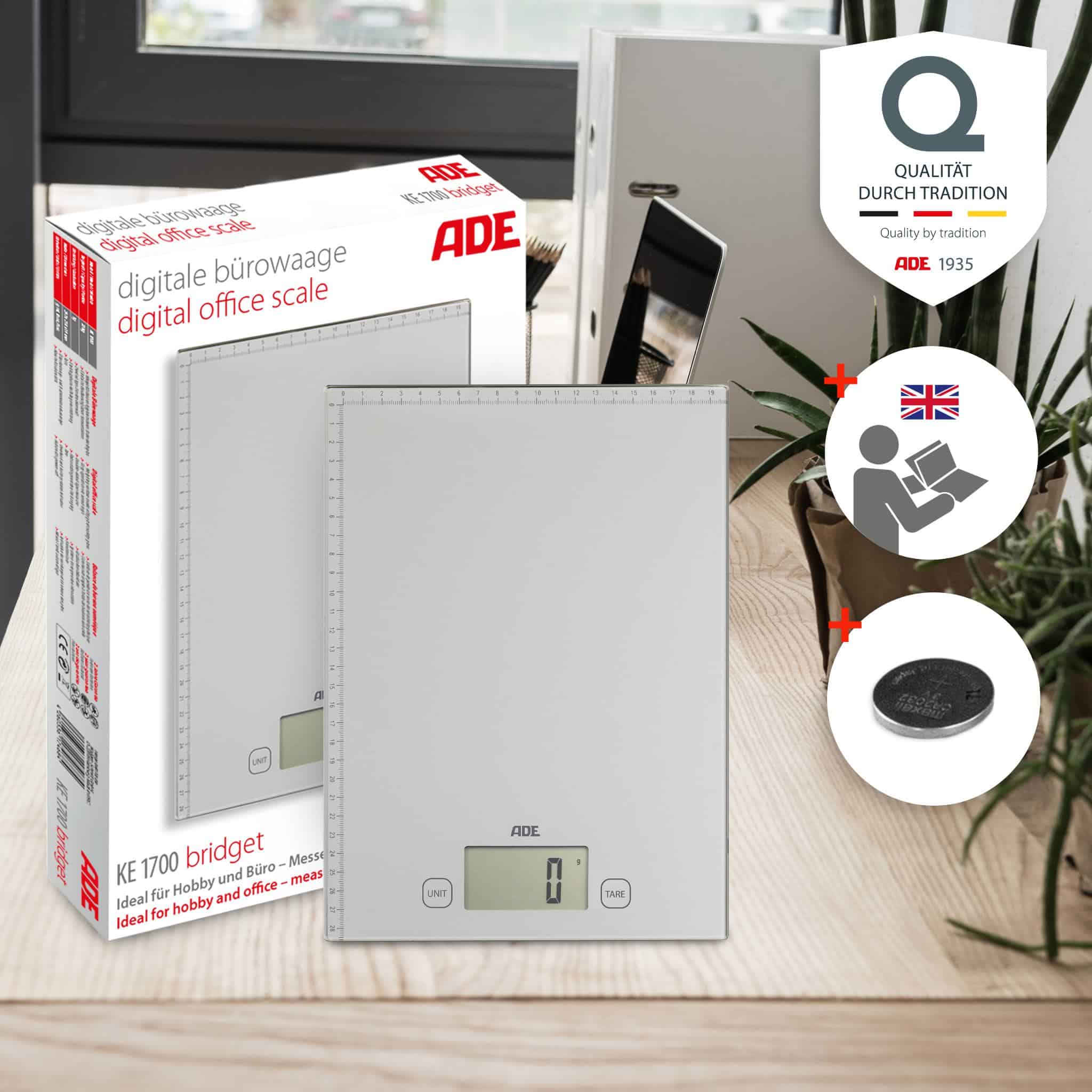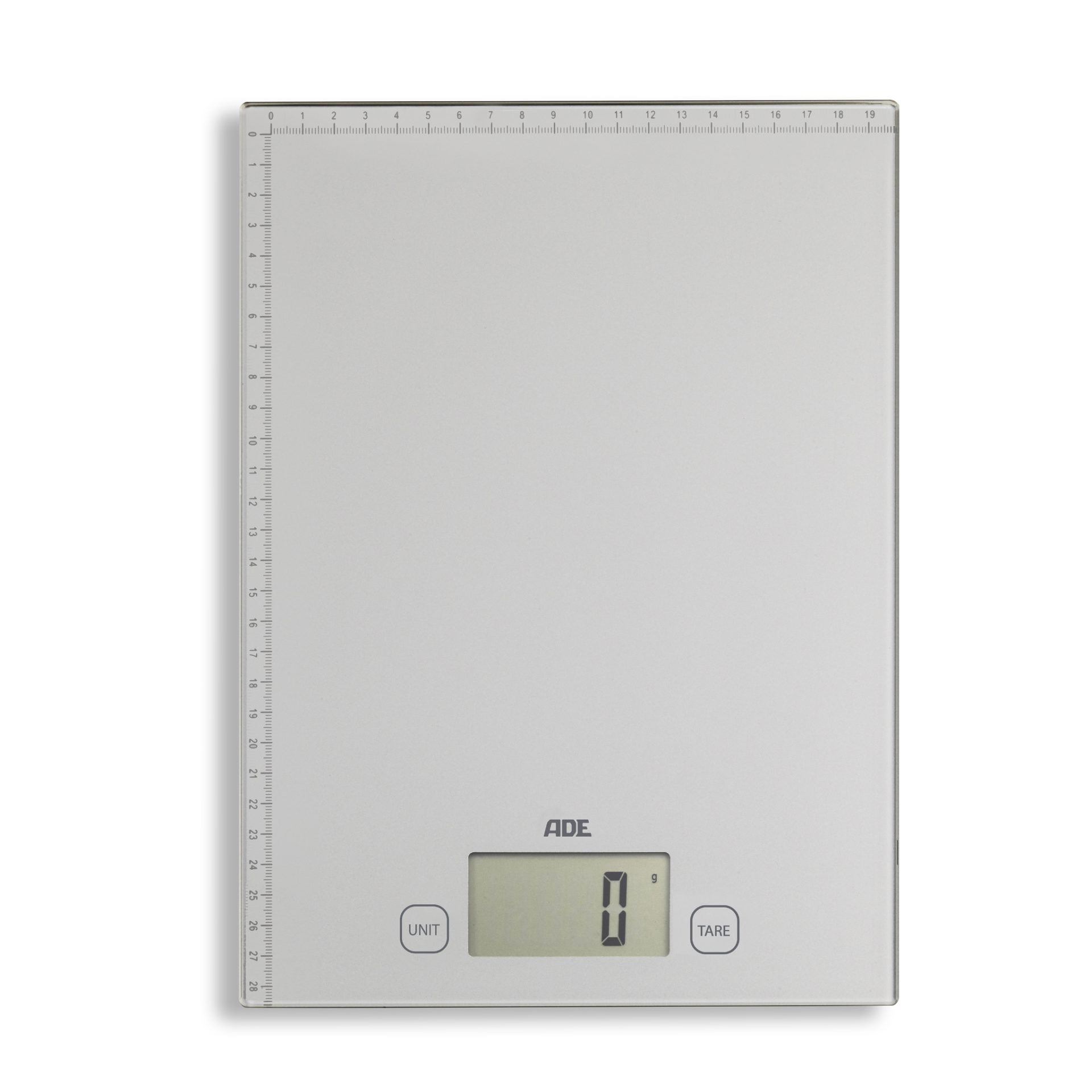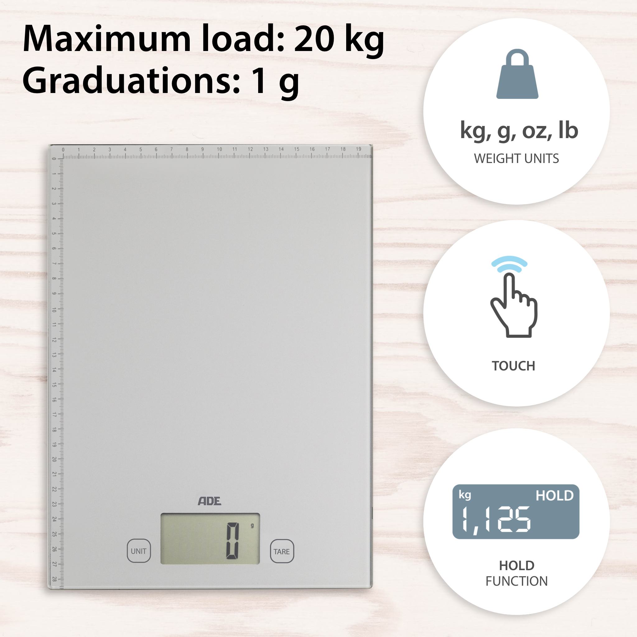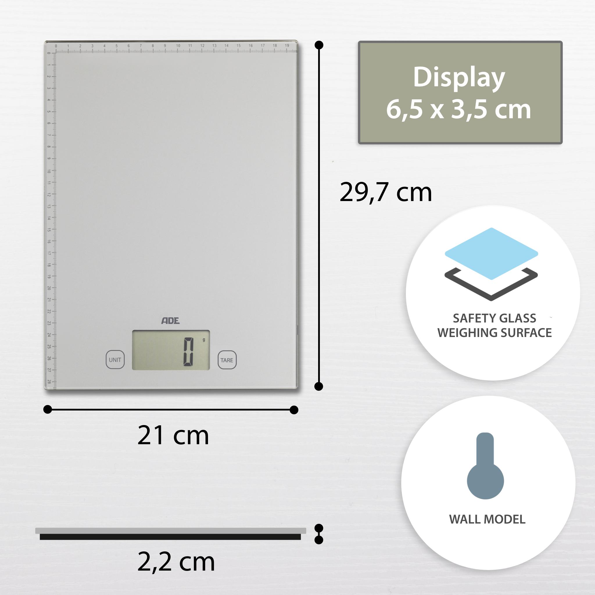 - Weighing surface made of hardened safety glass