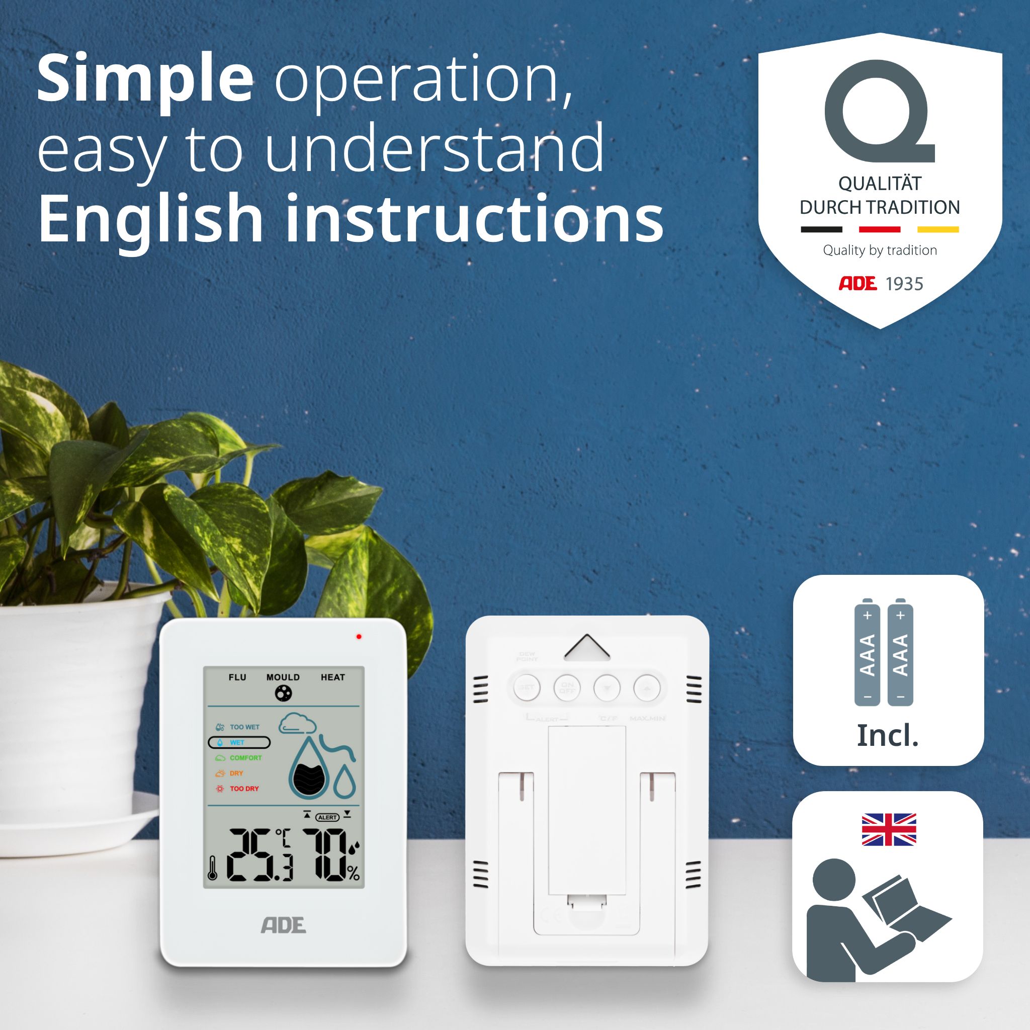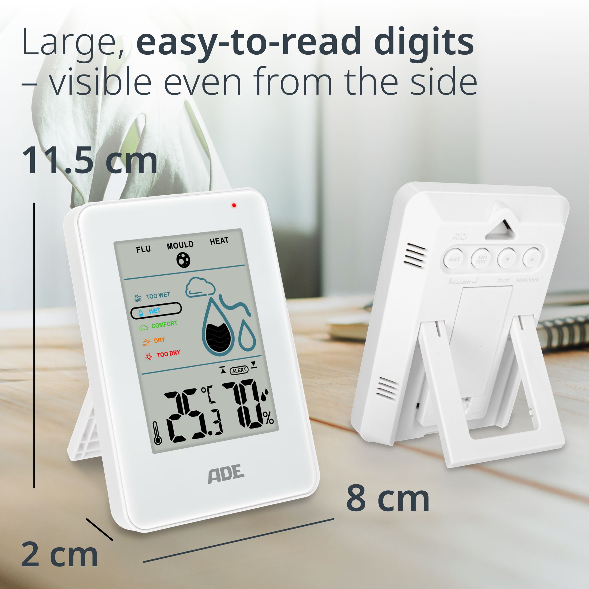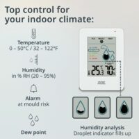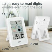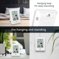 - With Thermometer: The digital hygrometer also functions as a room thermometer, measuring the room temperature. It also calculates the dew point – helpful for avoiding condensation on walls.