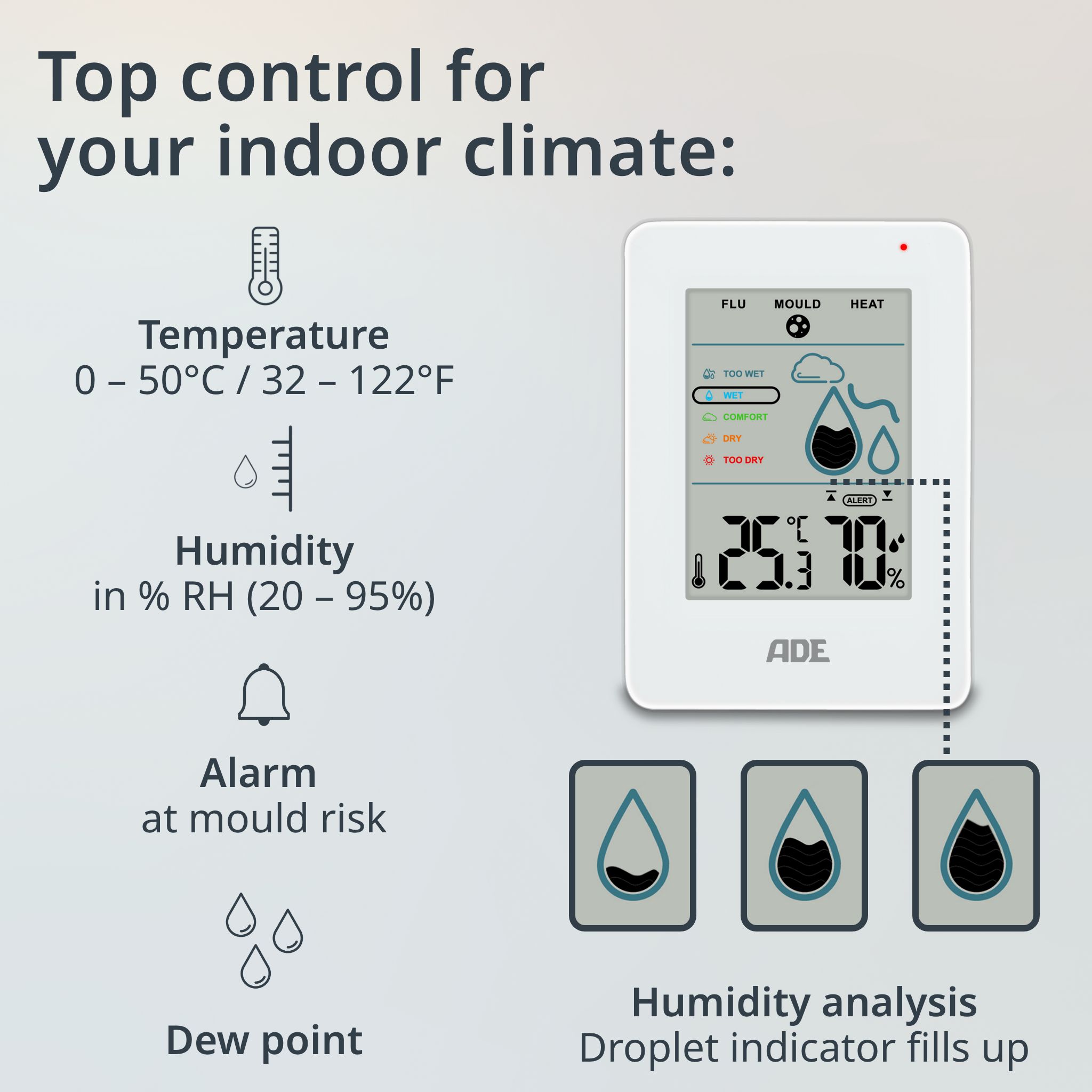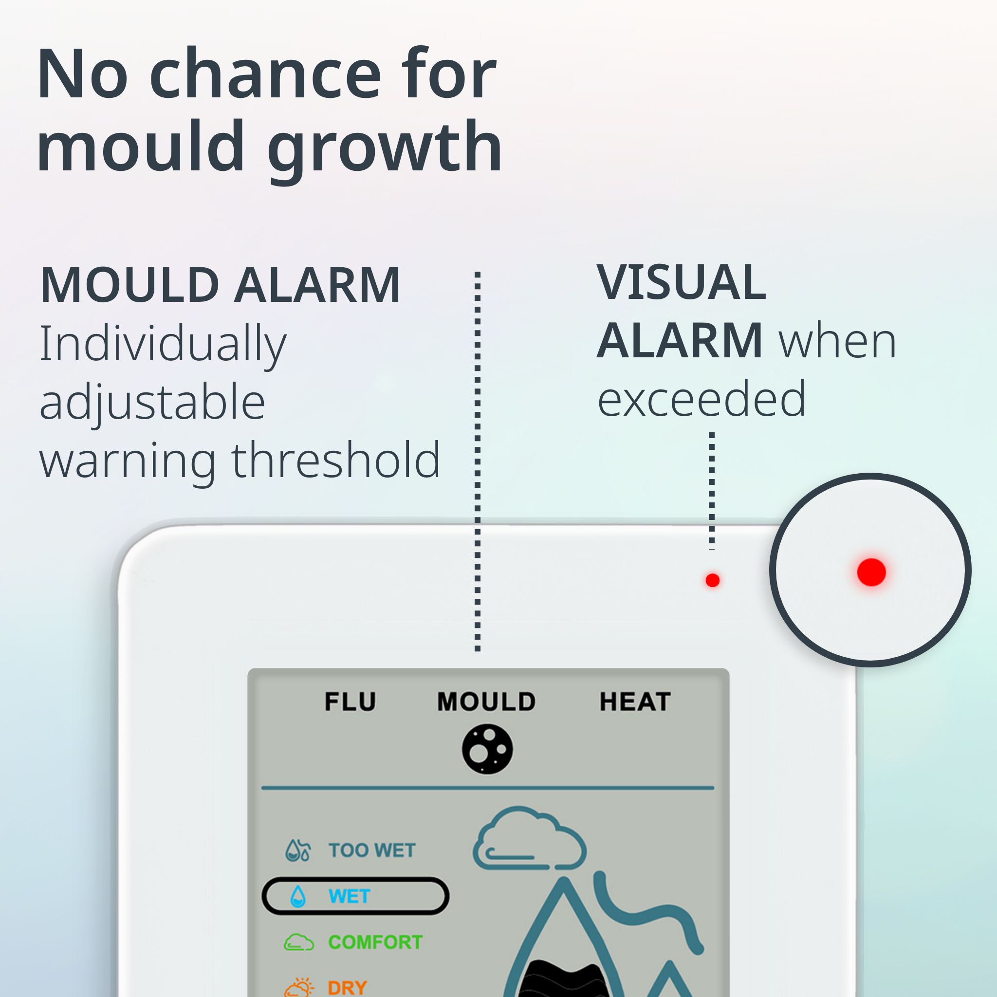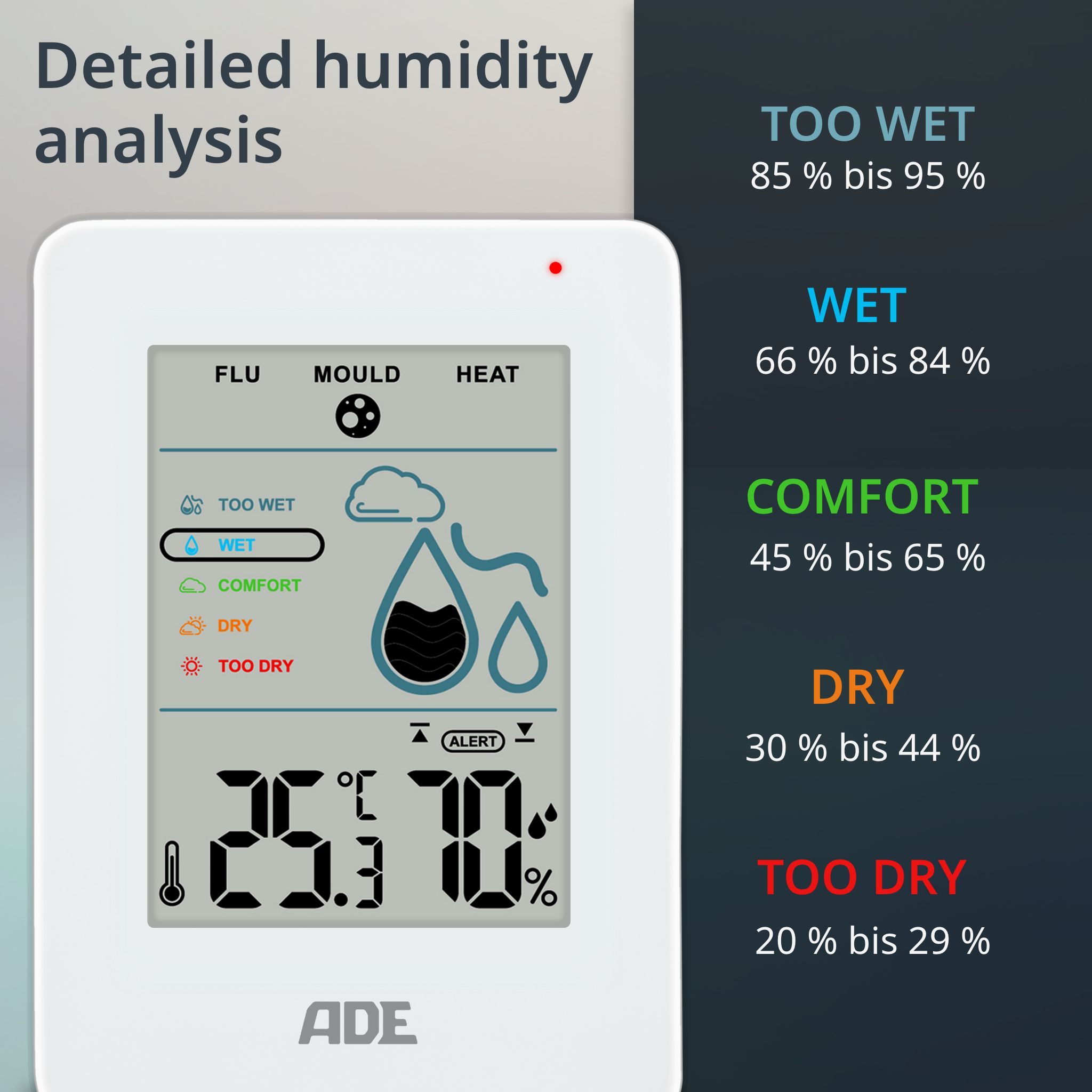 - Mold Alarm: The moisture meter measures the humidity in the room and alerts (audibly & visually) when this value becomes too high (individually adjustable thresholds). 5 Humidity Levels: too humid, humid, optimal, dry, too dry. Min/Max values of the last 12 hours.