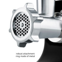 To start the machine, simply turn the knob once the desired attachment is mounted securely with a bayonet lock. This can be quickly attached and easily cleaned. With a substantial weight of 5.3 kilograms and four rubberized feet – the two rear feet additionally equipped with suction cups – the meat grinder provides excellent stability during use. The partially black lacquered aluminum housing measures (H x W x D) 370 x 180 x 316 millimeters. Nominal and maximum power: 800 and 2,000 watts respectively.