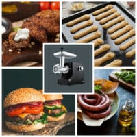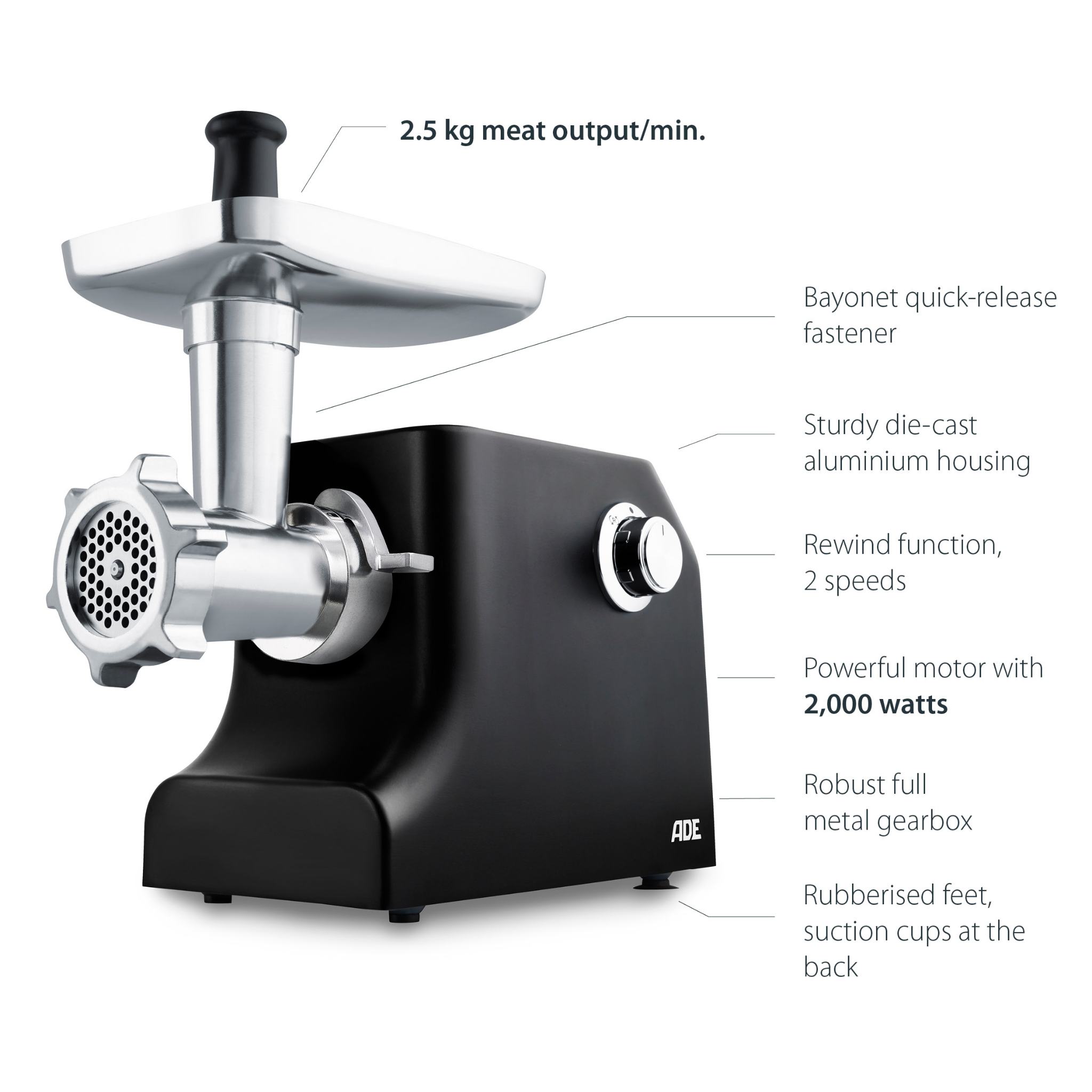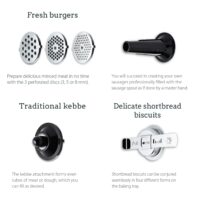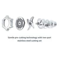 Powered by 2000 watts, the meat grinder can process all kinds of meat, handling 2.5 kilograms per minute. The powerful electric motor has forward and reverse functions, as well as two adjustable speeds. The device includes a two-piece cutting set, consisting of a blade and perforated disc. The accessories comprise three perforated discs (3, 5, and 8 mm in diameter), a kebbe attachment, sausage nozzle, pastry attachment, and a pusher.