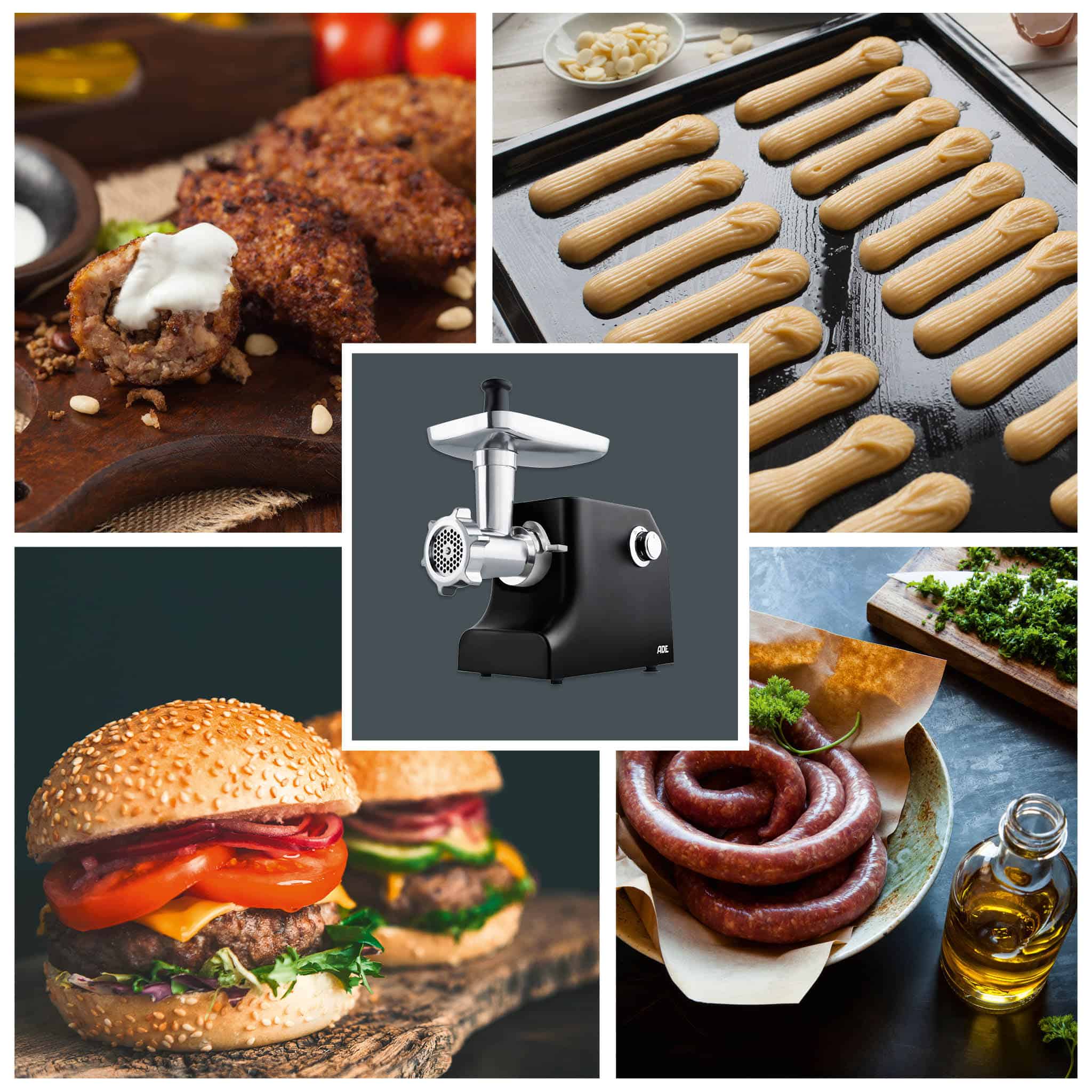 For all those who want to embark on a taste offensive and steer clear of industrially produced products, this kitchen machine is on the agenda. With the ADE meat grinder, hearty minced meat and fine sausages can be prepared effortlessly at home. It works best with meat from your trusted butcher. Crispy spritz cookies can also be easily prepared with the device, thanks to the pastry attachment.