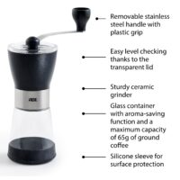 Freshly ground beans for perfect coffee enjoyment – this is no longer a challenge with the mechanical coffee grinder from ADE. The robust ceramic grinder allows a grinding degree setting from fine to coarse, completely individual and suitable for the respective coffee preparation method. The bean container protects beans from moisture and dust and is made of glass – also good for storing the ground coffee powder without loss of aroma (up to 65 g coffee powder).