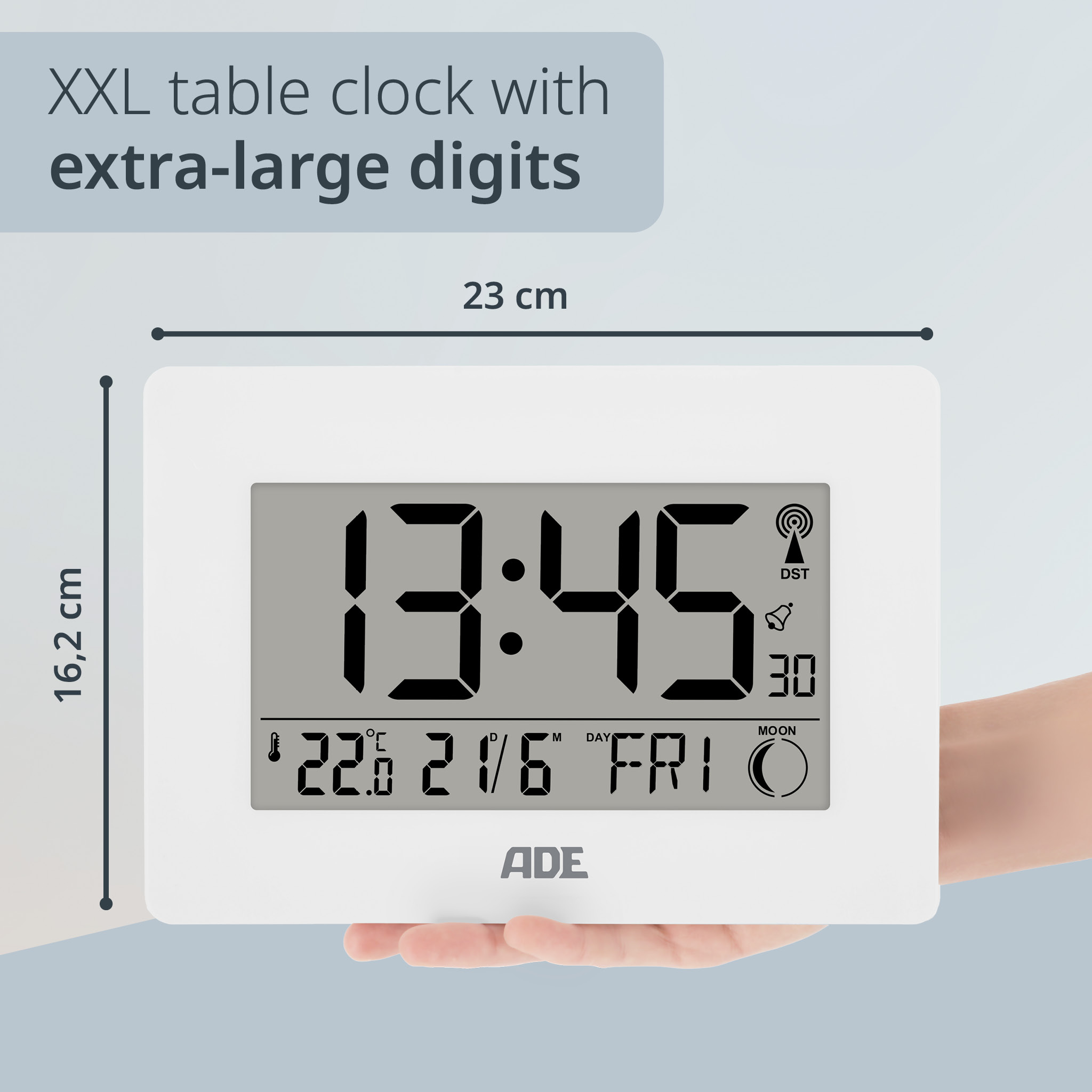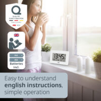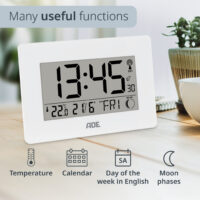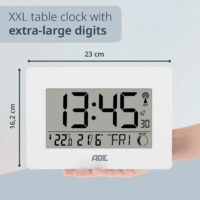 - Radio-controlled clock (DCF radio signal), automatic and manual time setting