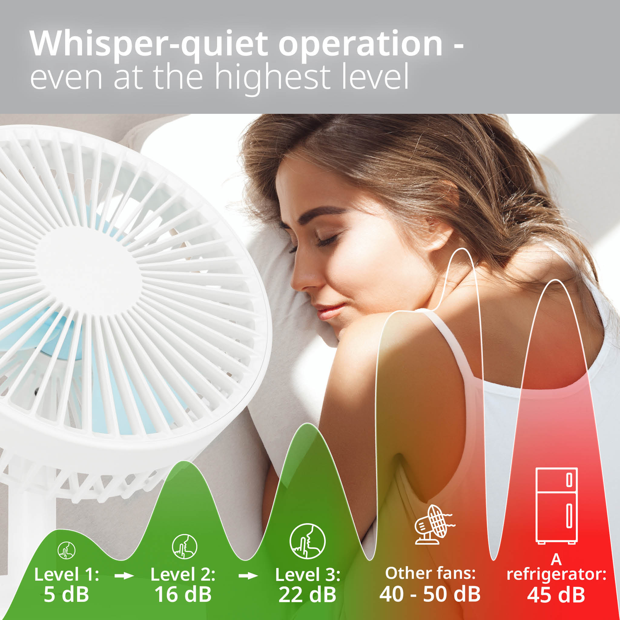 - Whisper Quiet Technology: With only 22 dB at the highest setting, this small fan is extremely quiet, making it ideal for disturbance-free work in the home office or peaceful sleep on warm summer nights.