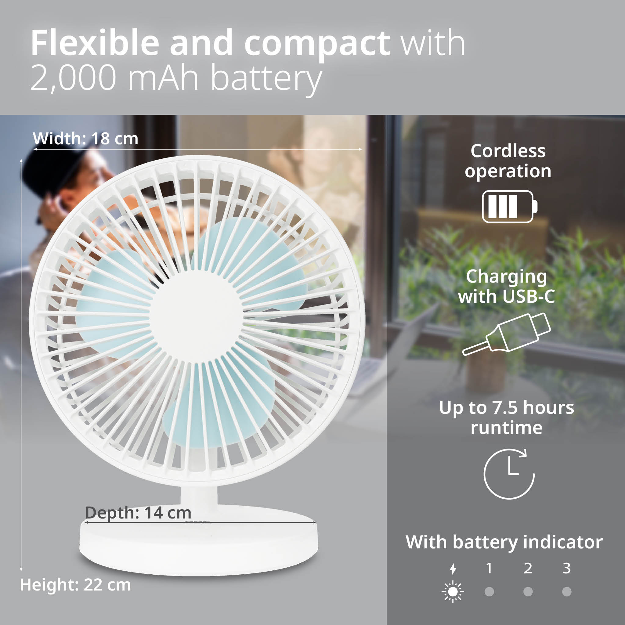 - Long battery life: Enjoy up to 7.5 hours of uninterrupted cooling without the hassle of cables (on level 1). A 1m long USB-C charging cable is included, with an indicator showing when the fan needs charging.