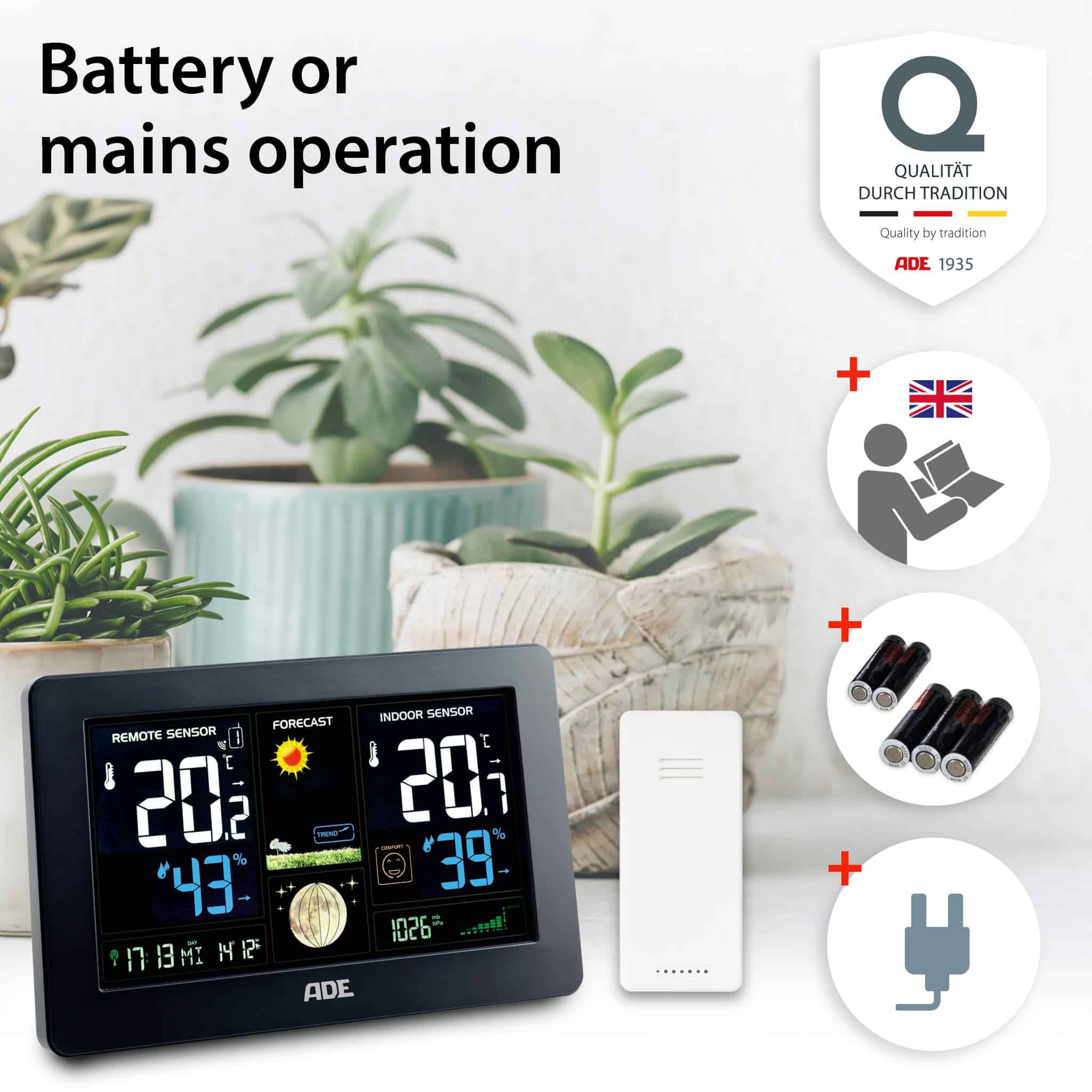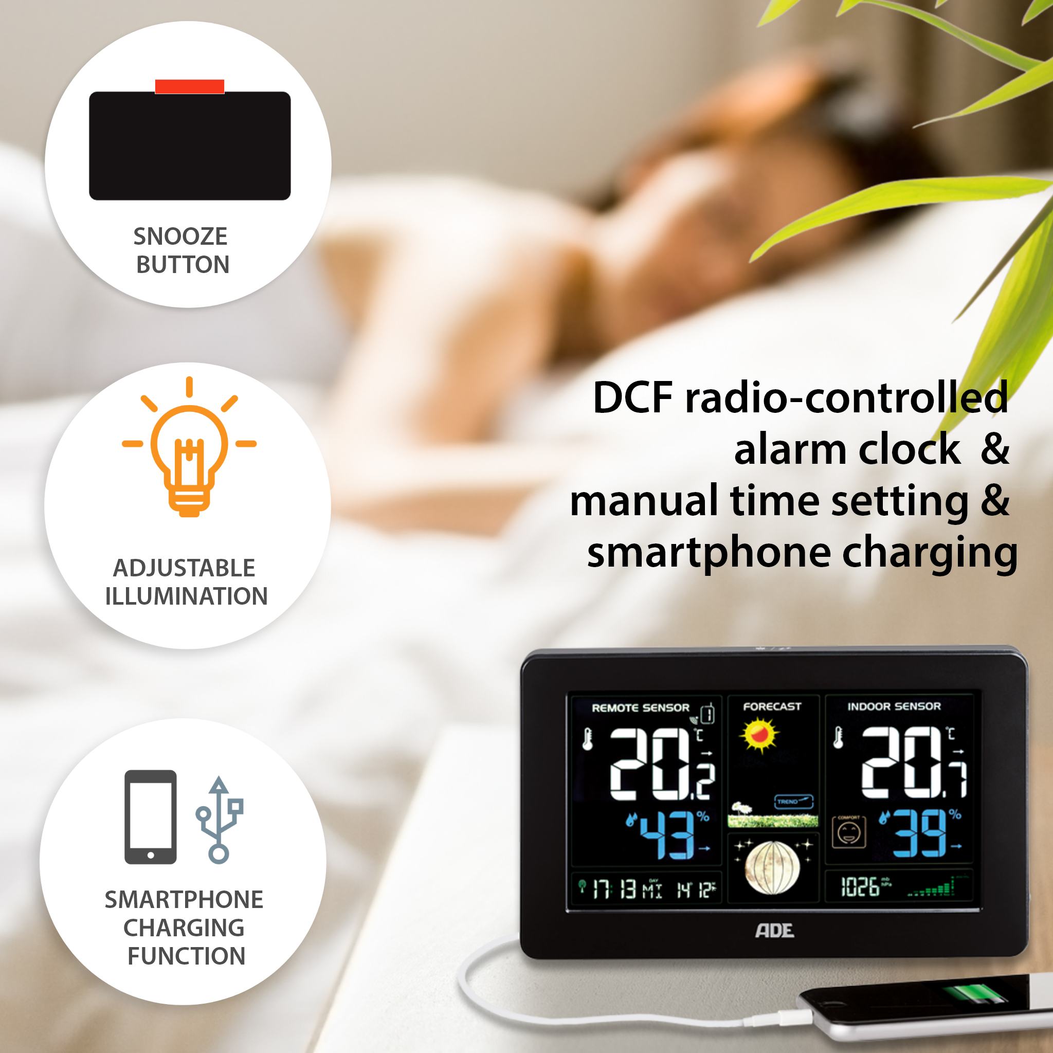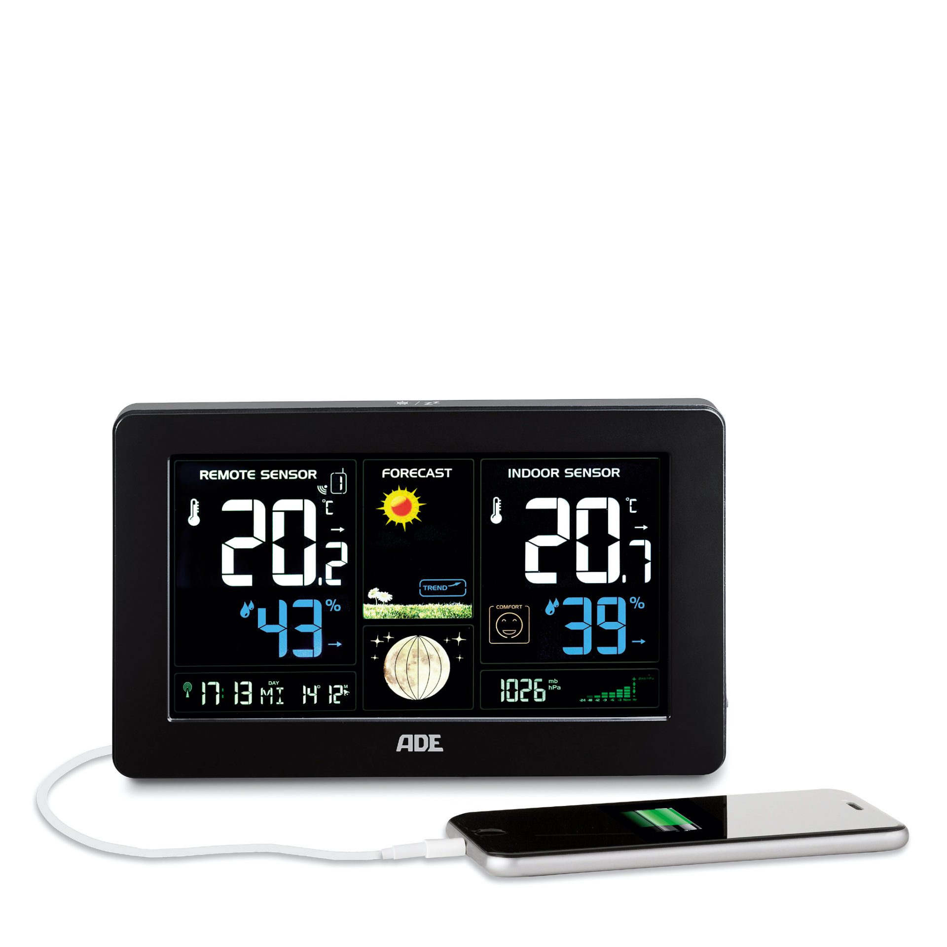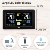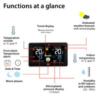 Something for the eye and something for the mobile phone. The clearly arranged weather station provides eight weather trends in animated form plus power for the smartphone via USB port. Also included: a barometer for optimal classification of air pressure conditions. Temperature and humidity can be measured both indoors and outdoors. If there is frost or high temperatures outside, the thermometer sounds an alarm. The smart device also includes a radio-controlled clock with DCF time signal, an alarm clock with snooze function and a perpetual calendar with day and date display in 8 languages.