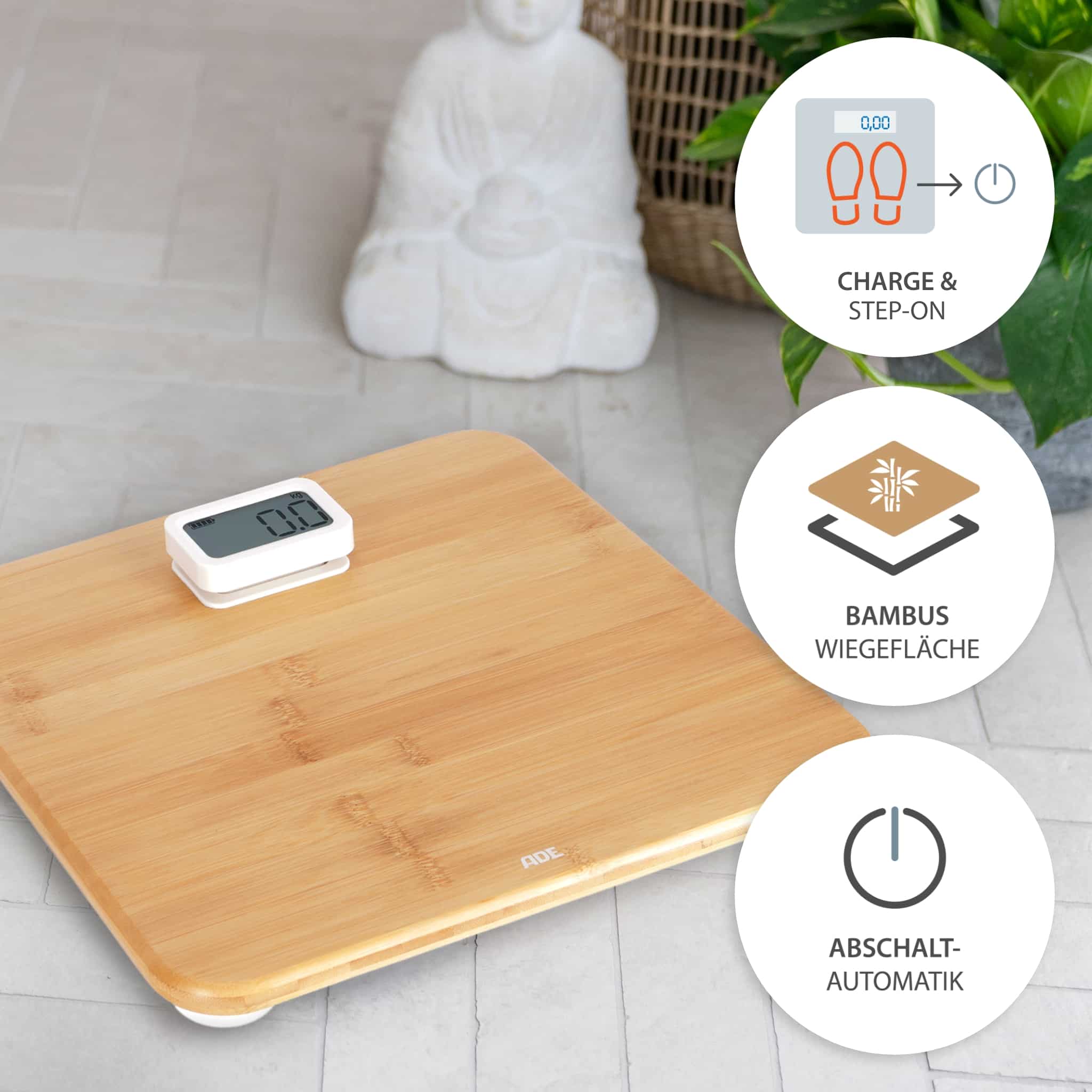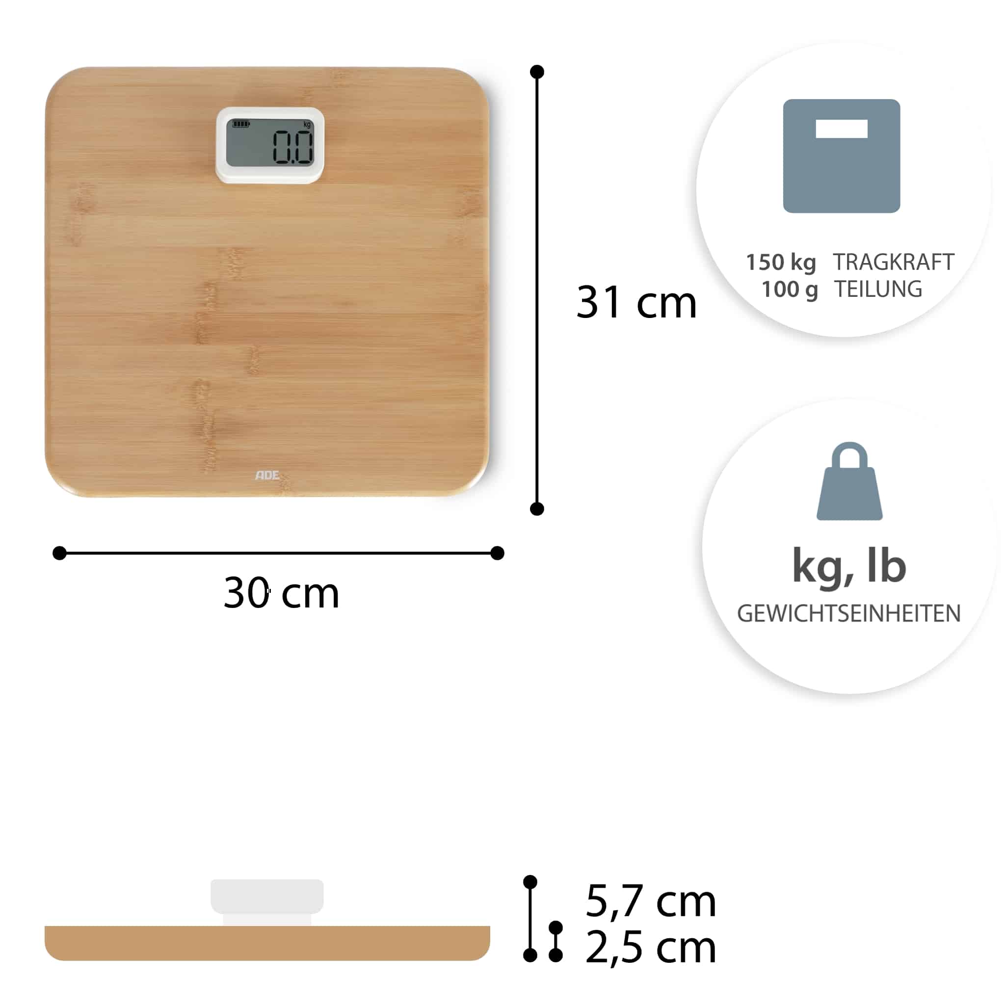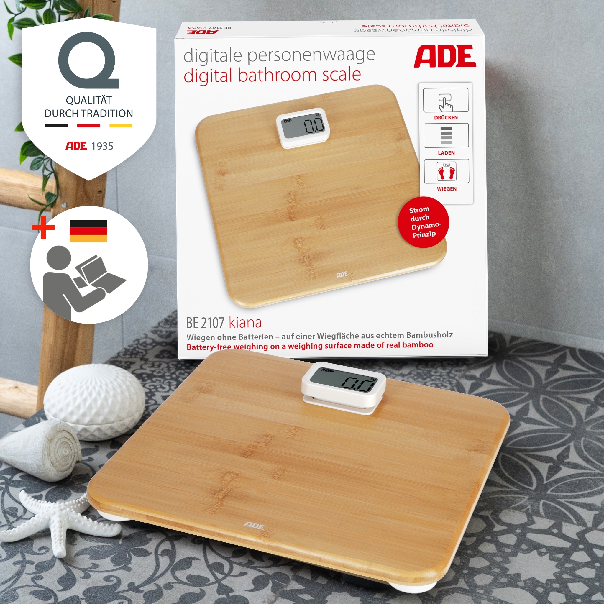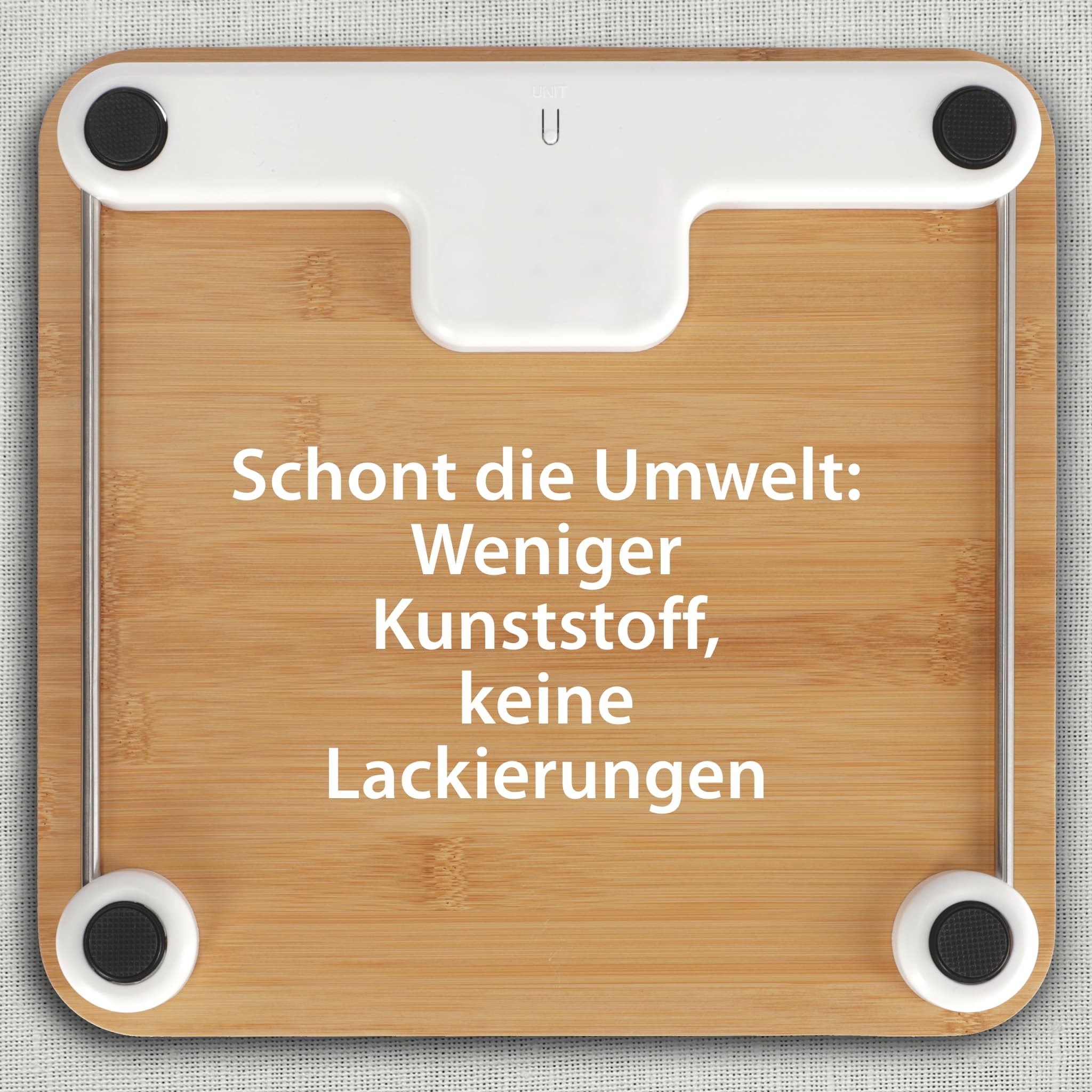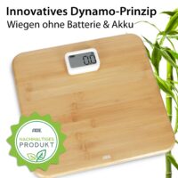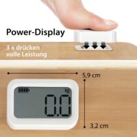 Badezimmerwaage Kiana birgt ein Bündel an umweltfreundlichen Details. Auf Batterien haben wir ganz verzichtet. Und doch funktioniert die Waage digital. Dank Power-Display mit Dynamo-Prinzip. Durch dreimaliges Drücken auf das Display wird der Dynamo aktiviert und die Waage ist bereit zum Wiegen. Der Waagen-Korpus ist aus dem nachwachsenden Rohstoff Bambus. Der Anteil an Kunststoff ist auf ein Minimum reduziert – lediglich an Wiegezellen und Display wurde weißer, unlackierter Kunststoff verbaut. Die 12 mm starke Trittfläche misst bequeme 310 x 300, das LCD-Display 59 x 32 Millimeter.