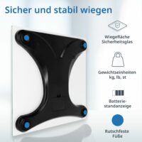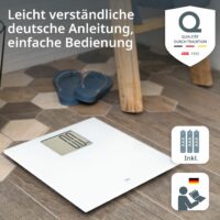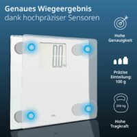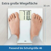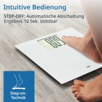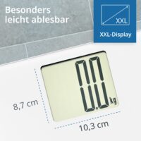 Die Große: Auf dem extragroßen XXL-Display wird kein Gramm übersehen. Mit ihrem Sichtfenster im Überformat ist die digitale Waage vor allem bei älteren Menschen eine ganz große Nummer. Das Display der Badezimmerwaage und die Ziffern selbst sind unübersehbar hoch. Bei so viel Großzügigkeit hält sich das Design der digitalen Körperwaage dezent zurück: mit schlicht weißem, gehärtetem Sicherheitsglas.