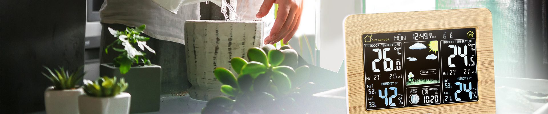 Das Thermometer verfügt über leicht ablesbare Ziffern, die auch von der Seite gut sichtbar sind. Die Bedienung erfolgt intuitiv über nur vier Tasten auf der Rückseite des Geräts. Der spritzwassergeschützte Außensensor kann flexibel im Garten, auf dem Balkon oder in anderen Zimmern im Zuhause aufgestellt oder aufgehängt werden.